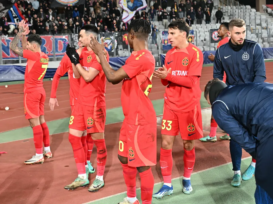 Fotbalistii stelisti Florinel Teodor Coman, Adrian Gheorghe Șut si Risto Radunovic saluta galeria dupa meciul de fotbal dintre Universitatea Cluj si FCSB, contând pentru Superliga Superbet, desfășurat pe Cluj Arena din Cluj Napoca, luni 19 februarie 2024. © FOTO: Răzvan PĂSĂRICĂ/SPORT PICTURES