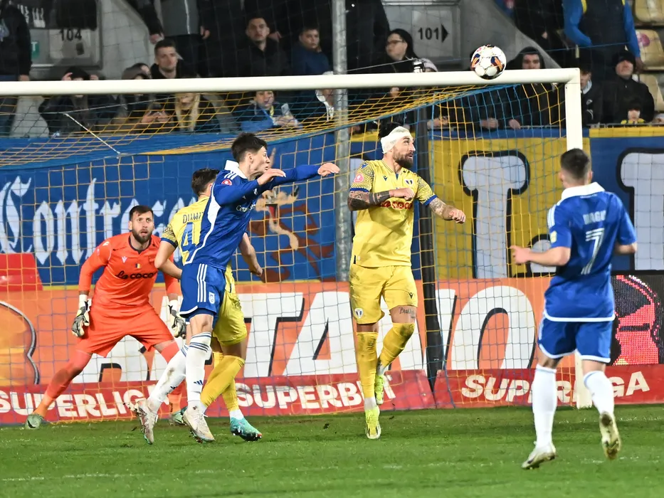 Lukas Zima, Vladislav Blanuta si Paul Papp în meciul de fotbal dintre Petrolul Ploiesti si FC U Craiova, contând pentru Play-out-ul Superligii Superbet, desfășurat pe Stadionul Ilie Oana din Ploiesti, luni 18 martie 2024. © FOTO: Răzvan PĂSĂRICĂ/SPORT PICTURES
