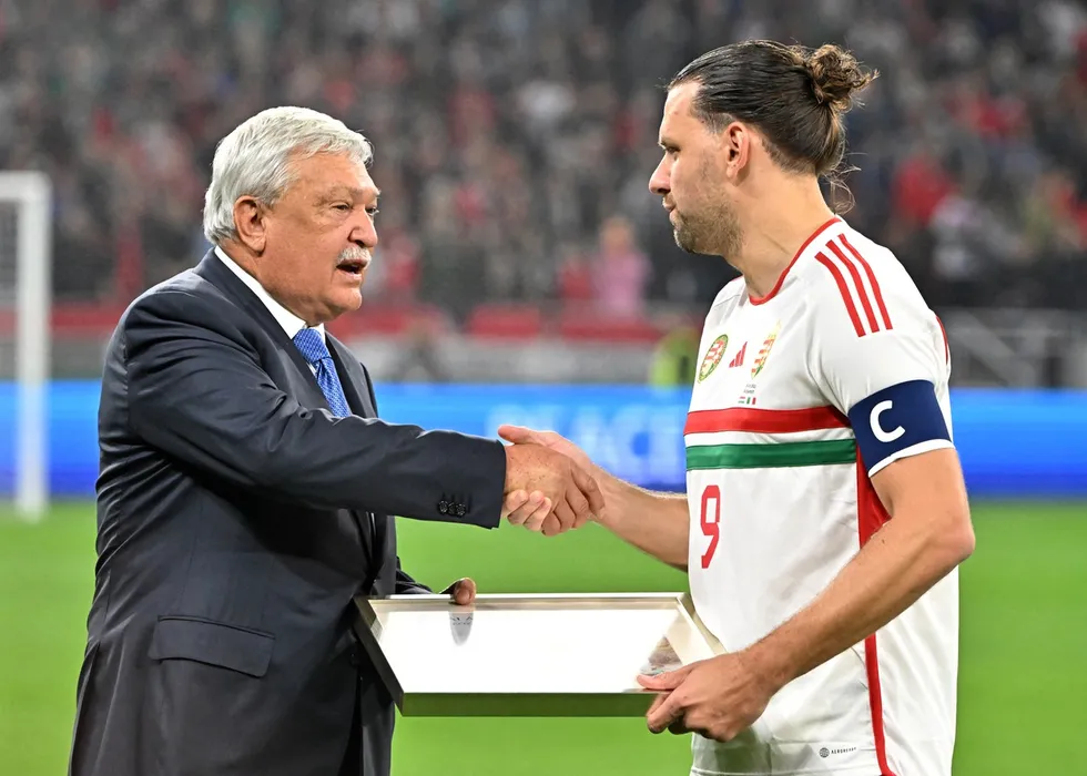 Hungary's forward and captain Adam Szalai iis offered a picture by the president of the Hungarian Football Federation (MLSZ) Sandor Csanyi (L) after his last international match after the UEFA Nations League Group 3 football match between Hungary and Italy in Budapest on September 26, 2022.,Image: 726445509, License: Rights-managed, Restrictions: , Model Release: no