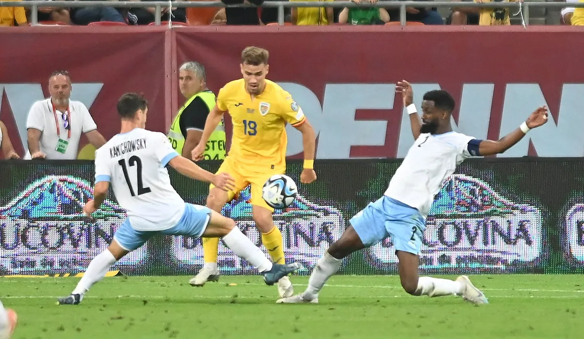Gavriel Kanichowsky, Darius Olaru si Eli Dasa in meciul de fotbal dintre Romania si Israel, din cadrul preliminariilor Campionatului European 2024, desfasurat pe Arena Nationala, sambata 9 septembrie 2023. © FOTO:Razvan Pasarica/SPORT PICTURES