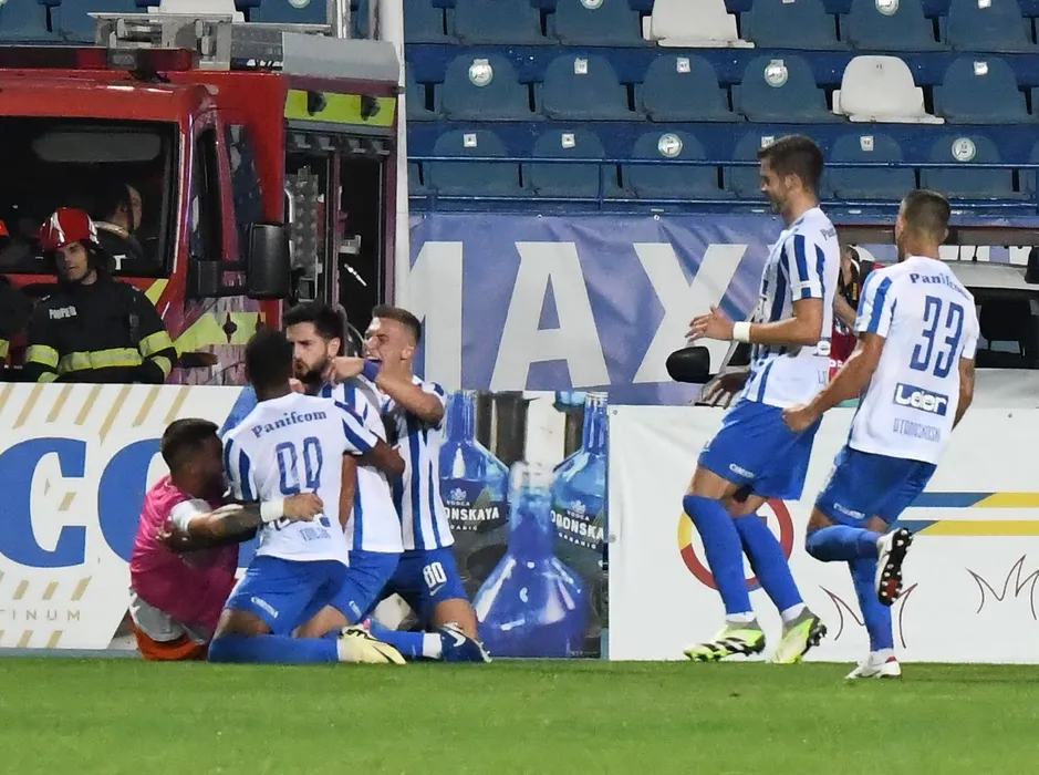 Fotbaliștii ieșeni se bucură după un gol marcat în meciul de fotbal dintre Poli Iași si Dinamo București, contând pentru SuperLiga Superbet, desfășurat pe Stadionul Emil Alexandrescu din Iași, luni 12 august 2024. © FOTO: Tudi/SPORT PICTURES