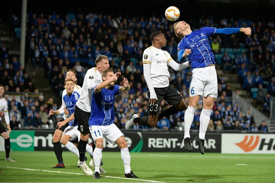 Genk's Sebastien Dewaest, Sarpsborg's Joackim Jorgensen, Genk's Jhon Lucumi and Sarpsborg's Joonas Tamm fight for the ball during a game of Belgian soccer team KRC Racing Genk against Norwegian Sarpsborg 08 FF, in Sarpsborg, Norway, Thursday 04 October 2018, on day two of the Europa League group stage in group I. BELGA PHOTO YORICK JANSENS,Image: 389836468, License: Rights-managed, Restrictions: , Model Release: no, Credit line: Profimedia
