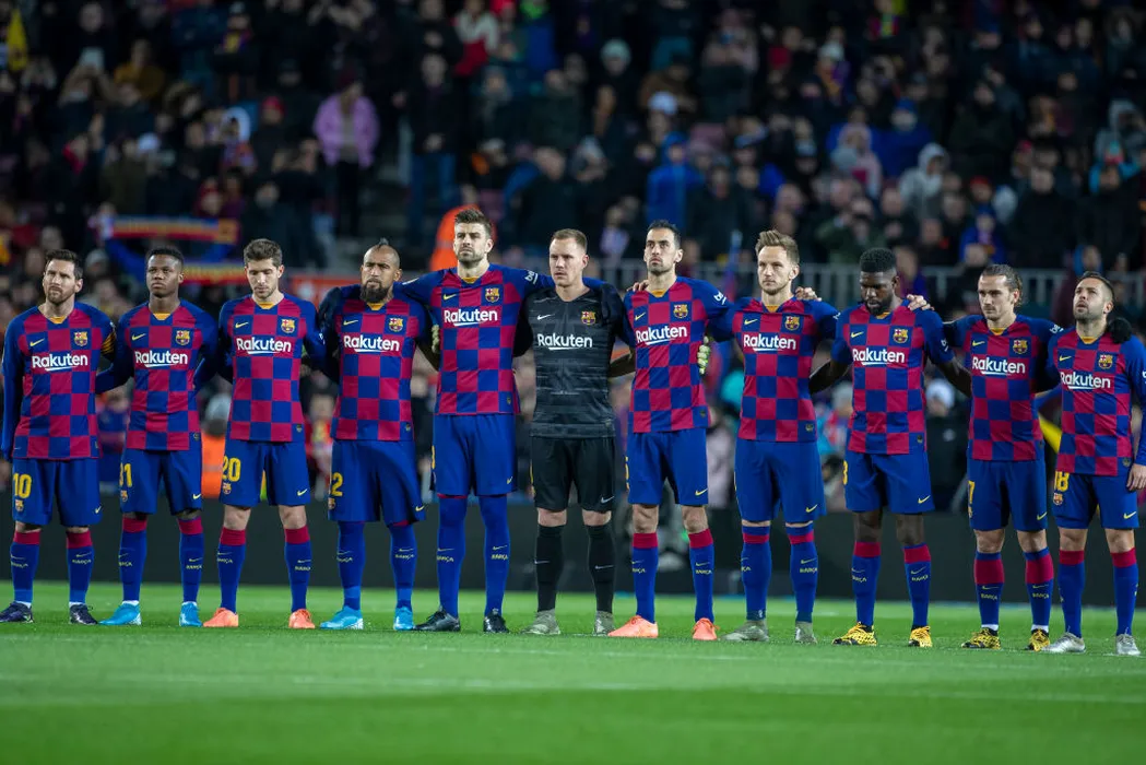 BARCELONA, SPAIN - January19: The Barcelona team line up for a commemorative moment before kick off. Left to right, Lionel Messi #10, Ansu Fati #31, Sergi Roberto #20, Arturo Vidal, Gerard Pique, Marc-Andre ter Stegen #1, Sergio Busquets #5, Ivan Rakitic #4, Samuel Umtiti #23, Antoine Griezmann #17, Jordi Alba #18 during the Barcelona V Granada, La Liga regular season match at Estadio Camp Nou on January 19th 2019 in Barcelona, Spain. (Photo by Tim Clayton/Corbis via Getty Images)