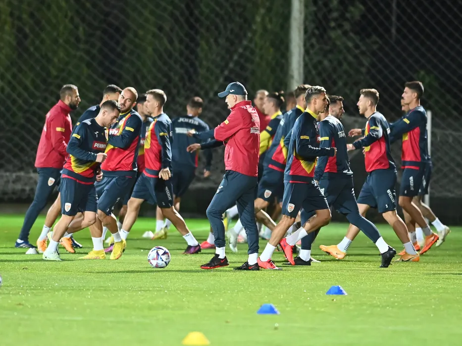 Fotbalistii romani Alexandru Cicâldău, Denis Alibec, Cristian Manea si Bogdan Mitrea alaturi de antrenorul lor Edward Iordanescu la antrenamentul oficial de dinaintea meciului impotriva Bosniei Hertegovina, contand pentru Liga Natiunilor, desfasurat la Centrul National de Fotbal din Mogosoaia, duminica 25 septembrie 2022. © FOTO:Razvan Pasarica/SPORT PICTURES