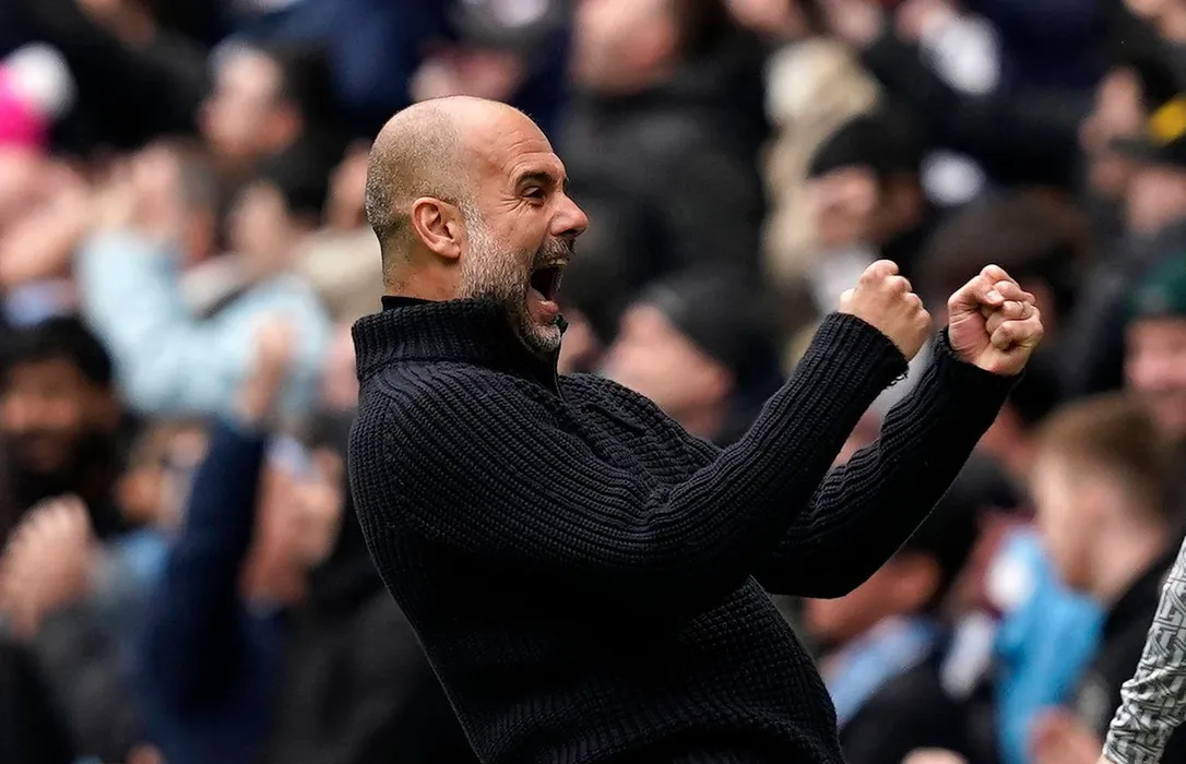 Manchester, England, 1st April 2023. Josep Guardiola manager of Manchester City celebrates after the first goal during the Premier League match at the Etihad Stadium, Manchester. Picture credit should read: / Sportimage EDITORIAL USE ONLY. No use with unauthorised audio, video, data, fixture lists, club/league logos or live services. Online in-match use limited to 120 images, no video emulation. No use in betting, games or single club/league/player publications. SPI-2340-0060,Image: 766547280, License: Rights-managed, Restrictions: , Model Release: no