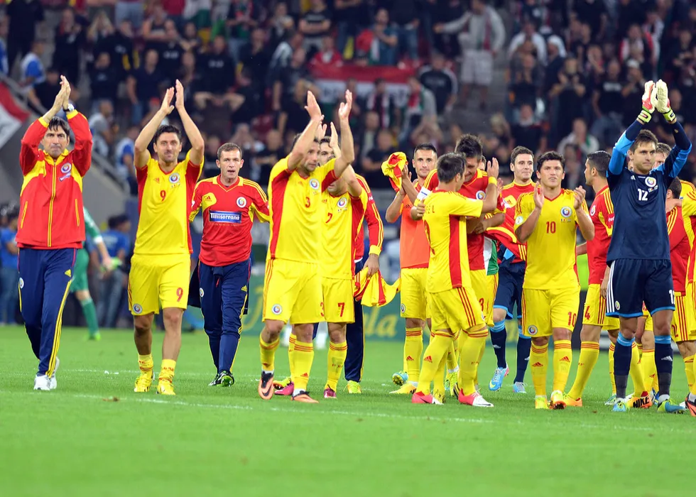 Fotbalistii tricolori Ciprian Marica,Bogdan Lobont,Razvan Rat,Cristian Tanase si Ciprian Tatarusanu alaturi de Victor Piturca saluta publicul la finalul jocului.
