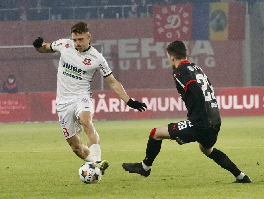 Constantin Dragos Albu si Alberto Soro Alvarez in meciul de fotbal dintre AFC Hermannstadt Sibiu si Dinamo Bucuresti, contand pentru Superliga Superbet, desfasurat pe Stadionul Municipal din Sibiu, vineri 23 ianuarie 2026. © FOTO:Valentin Macrea/SPORT PICTURES