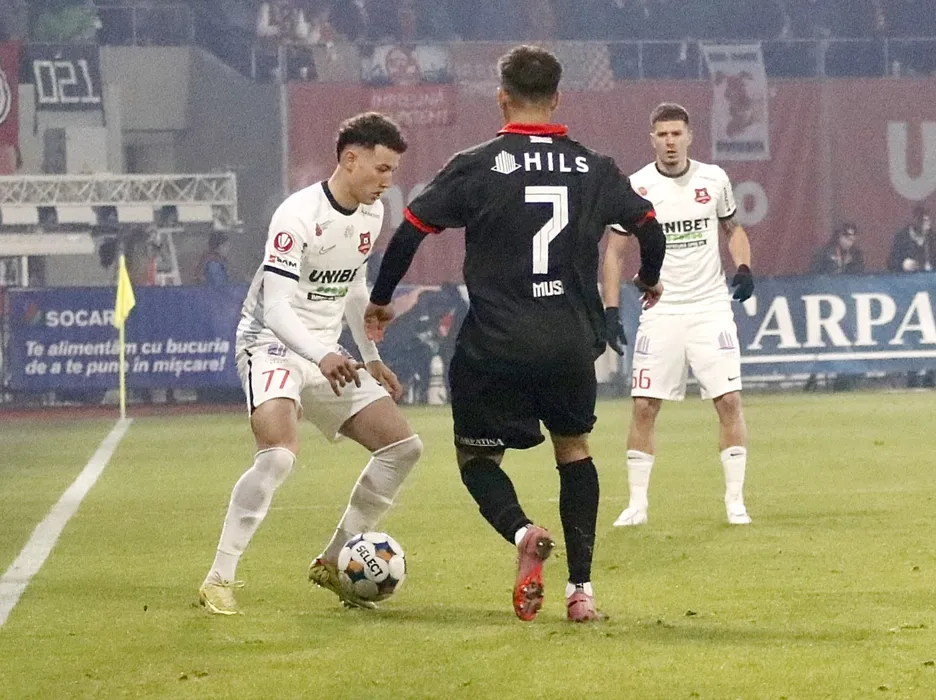 Luca Gabriel Stancu si Tiberiu Ionut Capusa in meciul de fotbal dintre AFC Hermannstadt Sibiu si Dinamo Bucuresti, contand pentru Superliga Superbet, desfasurat pe Stadionul Municipal din Sibiu, vineri 23 ianuarie 2026. © FOTO:Valentin Macrea/SPORT PICTURES