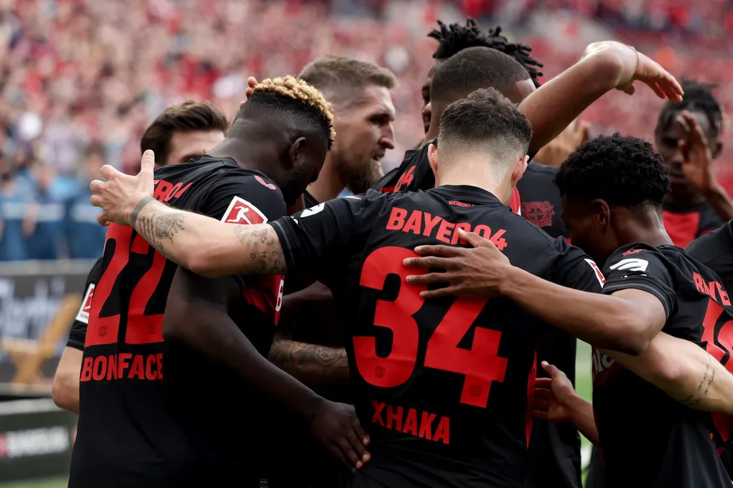 14 April 2024, North Rhine-Westphalia, Leverkusen: Soccer: Bundesliga, Bayer 04 Leverkusen - SV Werder Bremen, Matchday 29, BayArena. Leverkusen's players celebrate the 1:0 goal by Leverkusen's Victor Boniface (l). IMPORTANT NOTE: In accordance with the regulations of the DFL German Football League and the DFB German Football Association, it is prohibited to use or have used photographs taken in the stadium and/or of the match in the form of sequential images and/or video-like photo series.,Image: 864769777, License: Rights-managed, Restrictions: , Model Release: no