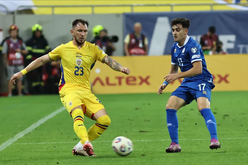 Deian Sorescu (S), de la echipa nationala de fotbal a Romaniei, lupta pentru balon cu Loizos Loizou (D), de la selectionata Ciprului, din preliminariile Cupei Mondiale din 2026, disputat pe Arena Nationala din Romania, marti, 10 iunie 2025. GEORGE FLUSTER / MEDIAFAX FOTO