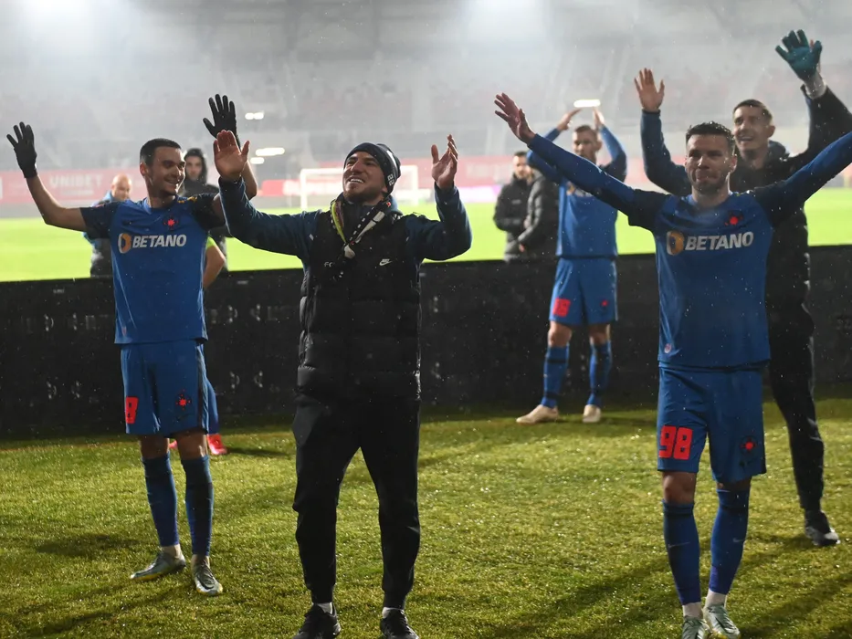 Fotbalistii stelisti Adrian Gheorghe Sut, Deian Cristian Sorescu si Andrei Ioan Cordea saluta galeria dupa meciul de fotbal dintre FC Hermannstadt si FCSB, contand pentru Superliga Superbet, desfasurat pe Stadionul Municipal din Sibiu, duminica 22 ianuarie 2023. © FOTO:Razvan Pasarica/SPORT PICTURES