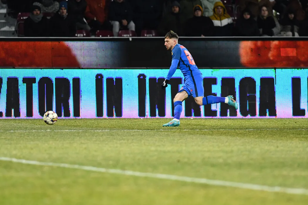 Deian Sorescu, de la FCSB, suteaza in timpul meciului de fotbal contra echipei CFR Cluj din etapa a XXIV-a a Superligii, disputat pe stadionul Constantin Radulescu din Cluj-Napoca, duminica,5 februarie 2023. FLAVIU BUBOI / MEDIAFAX FOTO