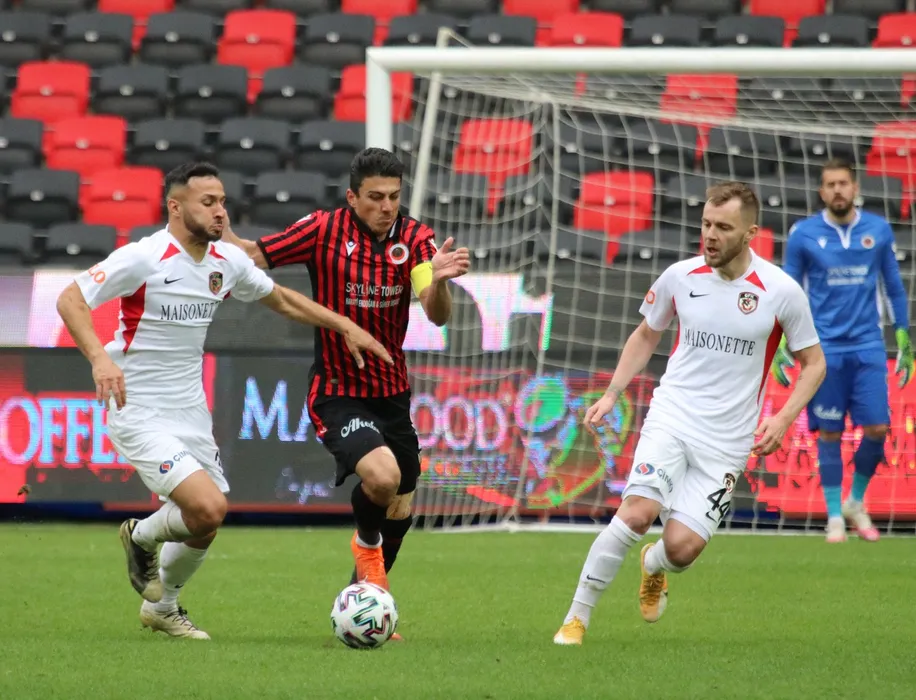 GAZIANTEP, TURKEY - MARCH 02: Rashid (L) and Maxim (R) of Gaziantep FK in action against Soner Dikmen (C) of Genclerbirligi during Turkish Super Lig week 28 match between Gaziantep FK and Genclerbirligi at Kalyon Stadium in Gaziantep, Turkey on March 02, 2021. Adsiz Gunebakan / Anadolu Agency,Image: 594598150, License: Rights-managed, Restrictions: , Model Release: no