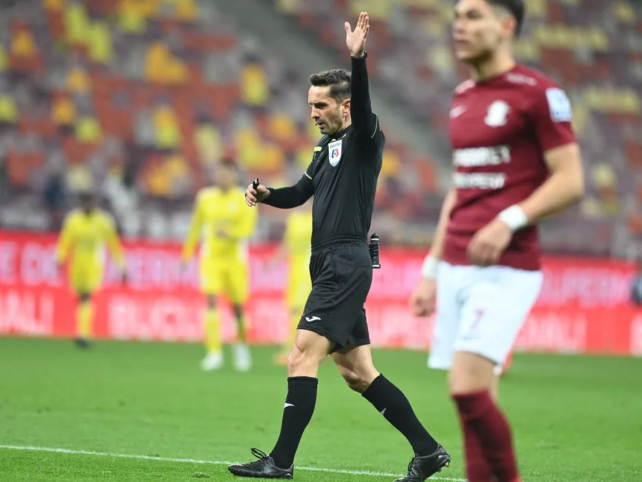 Arbitrul central Sebastian Constantin Coltescu reactioneaza in meciul de fotbal dintre Rapid Bucuresti si Petrolul Ploiesti, contand pentru Superliga Superbet, desfasurat pe Arena Nationala din Bucuresti, miercuri 14 decembrie 2022. © FOTO:Razvan Pasarica/SPORT PICTURES