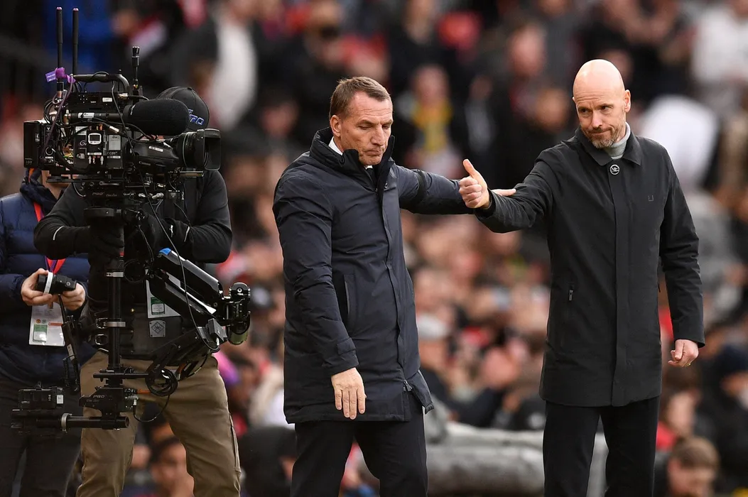 Manchester United's Dutch manager Erik ten Hag (R) gestures to Leicester City's Northern Irish manager Brendan Rodgers after the English Premier League football match between Manchester United and Leicester City at Old Trafford in Manchester, north west England, on February 19, 2023.,Image: 757129401, License: Rights-managed, Restrictions: RESTRICTED TO EDITORIAL USE. No use with unauthorized audio, video, data, fixture lists, club/league logos or 'live' services. Online in-match use limited to 120 images. An additional 40 images may be used in extra time. No video emulation. Social media in-match use limited to 120 images. An additional 40 images may be used in extra time. No use in betting publications, games or single club/league/player publications., Model Release: no
