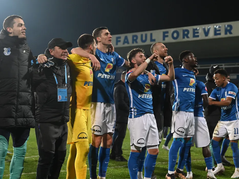 Fotbalistii constanteni Ionut Justinian Larie, Roberto Carlo Casap, Denis Alibec, Enagnon David Kiki si Mateus Santos Barbosa alaturi de Gheorghe Hagi saluta galeria dupa meciul de fotbal dintre Farul Constanta si Rapid Bucuresti, contand pentru Superliga Superbet, desfasurat pe Stadionul central al Academiei Gheorghe Hagi din Ovidiu, sambata 11 martie 2023. © FOTO:Razvan Pasarica/SPORT PICTURES