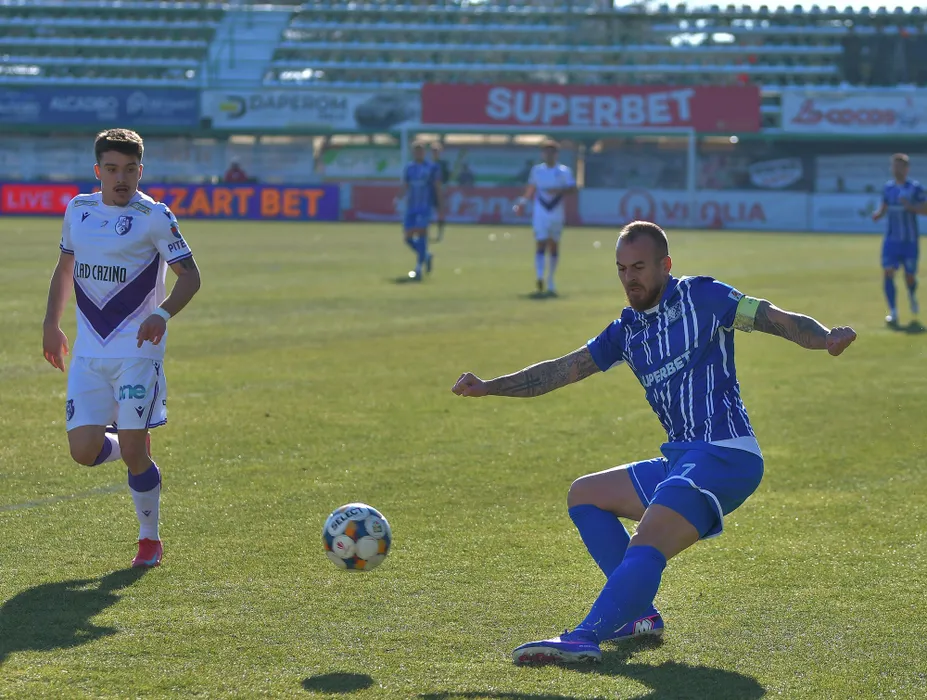 Denis Alibec si Yanis Christian Nikolas Pirvu in meciul de fotbal dintre FC Arges si FC Farul Constanta, contand pentru Superliga Superbet, desfasurat pe Stadionul Orasenesc din Mioveni, duminica 22 februarie 2026. © FOTO:Mihai Nitoiu/SPORT PICTURES