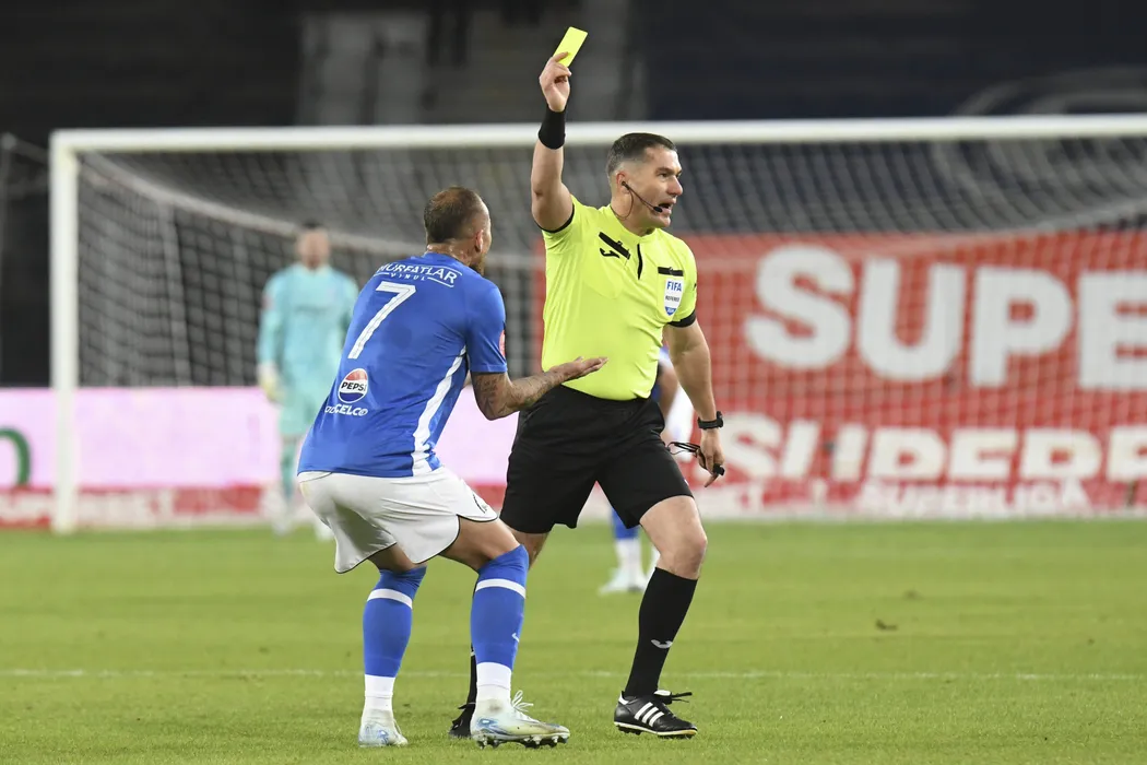 Arbitrul central Istvan Kovacs îi arată cartonașul galben lui Denis Alibec în meciul de fotbal dintre FC Universitatea Cluj și Farul Constața, contând pentru Superliga Superbet, desfășurat pe Stadionul Cluj Arena din Cluj-Napoca, duminică 3 noiembrie 2024. © FOTO: Flaviu BUBOI/SPORT PICTURES