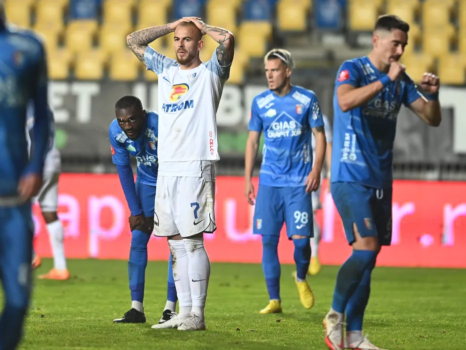 Denis Alibec reactioneaza in meciul de fotbal dintre Chindia Targoviste si Farul Constanta, contand pentru Superliga Superbet, desfasurat pe Stadionul Ilie Oana din Ploiesti, sambata 12 noiembrie 2022. © FOTO:Razvan Pasarica/SPORT PICTURES