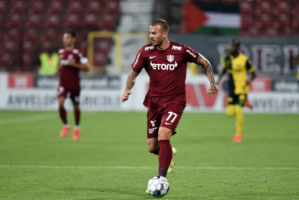 Denis Alibec (S), de la CFR Cluj, suteaza in timpul meciului de fotbal contra echipei Young Boys din turul 3 preliminar al Ligii Campionilor, disputat pe stadionul Dr. Constantin Radulescu, marti, 3 august 2021. DAN HORIA TAUTAN / MEDIAFAX FOTO