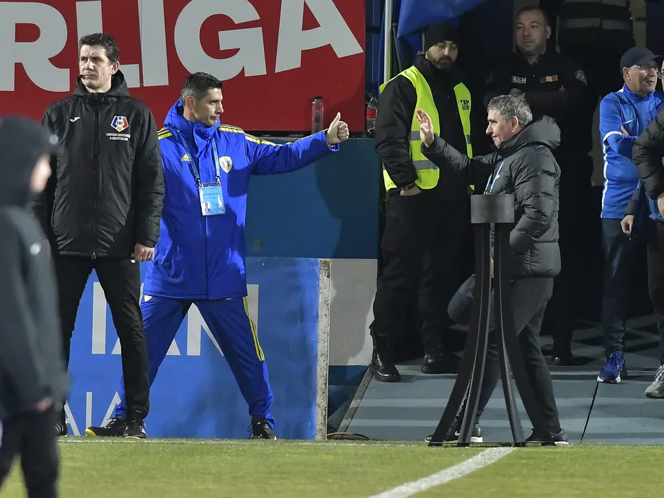 Cei doi antrenori Florin Pirvu si Gheorghe Hagi se saluta sub privirile arbitrului de rezerva Horia Gabriel Mladinovici inaintea meciului de fotbal dintre Farul Constanta si Petrolul Ploiesti, contand pentru Superliga Superbet, desfasurat pe Stadionul central al Academiei Gheorghe Hagi din Ovidiu, sambata 18 februarie 2023. © FOTO:Razvan Pasarica/SPORT PICTURES