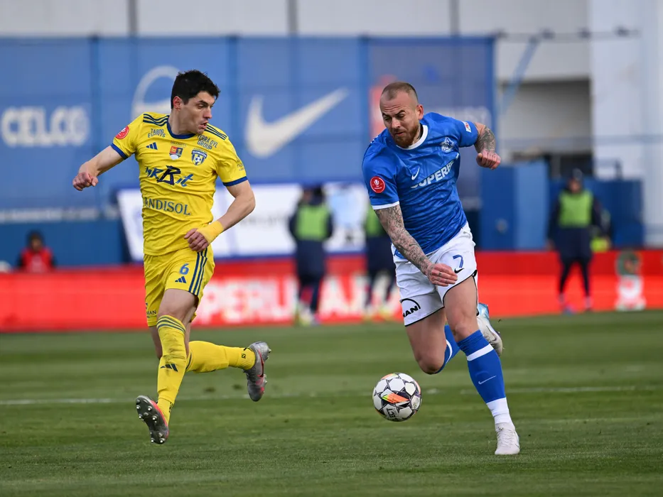 Marius Paul Antoche si Denis Alibec in meciul de fotbal dintre Farul Constanta si Unirea Slobozia, contand pentru Play out-ul Superligii Superbet, desfasurat pe Stadionul central al Academiei Gheorghe Hagi din Ovidiu, luni 7 aprilie 2025. © FOTO:Razvan Pasarica/SPORT PICTURES