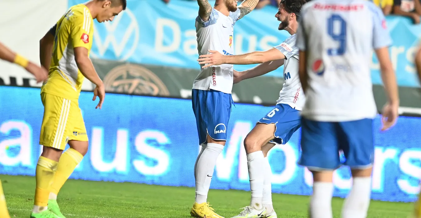 Denis Alibec se bucura dupa un gol marcat alaturi de Tudor Cristian Baluta in meciul de fotbal dintre Petrolul Ploiesti si Farul Constanta, contand pentru Superliga Superbet, desfasurat pe Stadionul Ilie Oana din Ploiesti, vineri 16 septembrie 2022. © FOTO:Razvan Pasarica/SPORT PICTURES