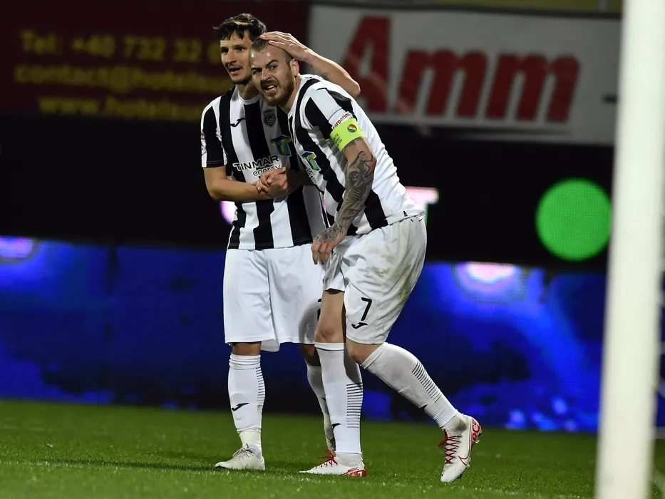Denis Alibec este felicitat de catre Ljuban Crepulja dupa ce a obtinut un penalty in meciul de fotbal dintre Astra Giurgiu si FC Botosani, contand pentru Liga 1 Casa Pariurilor, disputat pe Stadionul Marin Anastasovici din Giurgiu, vineri 6 martie 2020. © FOTO:Razvan Pasarica/SPORT PICTURES