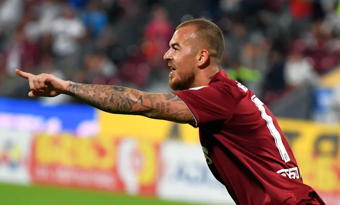Denis Alibec, de la CFR Cluj, reactioneaza dupa ce a inscris un gol in timpul meciului de fotbal contra echipei Chindia Targoviste din etapa a III-a a Ligii 1, disputat pe stadionul Dr. Constantin Radulescu din Cluj-Napoca, sambata, 31 iulie 2021. FLAVIU BUBOI / MEDIAFAX FOTO