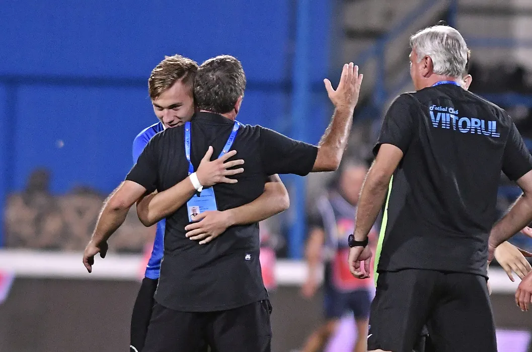 Denis Dragus este felicitat de Gica Hagi dupa meciul de fotbal dintre FC Viitorul si Gaz Metan Medias, contand pentru Liga 1 Betano, desfasurat pe Stadionul central al Academiei Gheorghe Hagi din Ovidiu, sambata 18 august 2018. © FOTO Razvan Pasarica/SPORT PICTURES