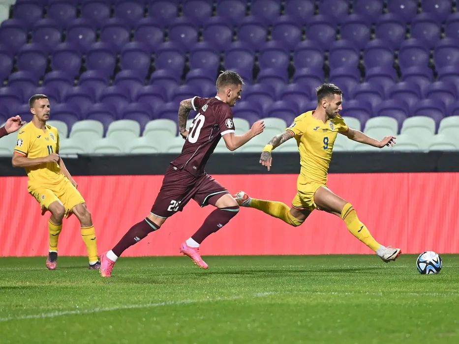 Nicușor Bancu, Zakhar Volkov si Denis Dragus in meciul de fotbal dintre Belarus si Romania, din cadrul preliminariilor Campionatului European 2024, desfasurat pe Stadionul Szusza Ferenc din Budapesta, joi 12 octombrie 2023. © FOTO:Razvan Pasarica/SPORT PICTURES