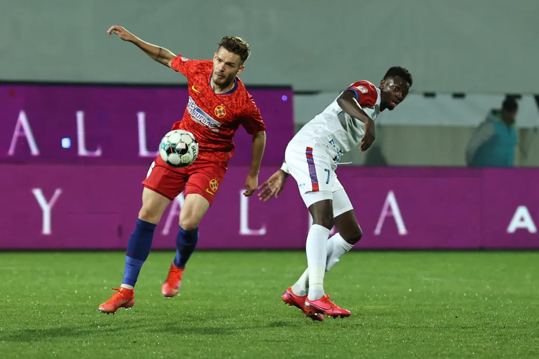 Denis Harut (S), de la FCSB, lupta pentru balon cu Hamidou Keita (D), de la FC Botosani in meciul de fotbal din prima etapa a play-off-ului Ligii 1, disputat pe stadionul Marin Anastasovici din Giurgiu, duminica, 18 aprilie 2021. George Filip / MEDIAFAX FOTO