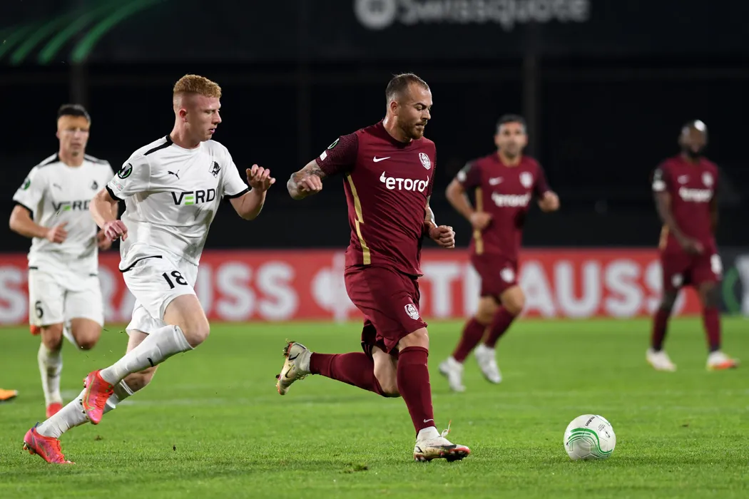 Echipele CFR Cluj (echipament visiniu) si Randers s-au intalnit intr-o partida din Grupa D a Conference League de fotbal, joi, 30 septembrie 2021, la Cluj. FLAVIU BUBOI / MEDIAFAX FOTO