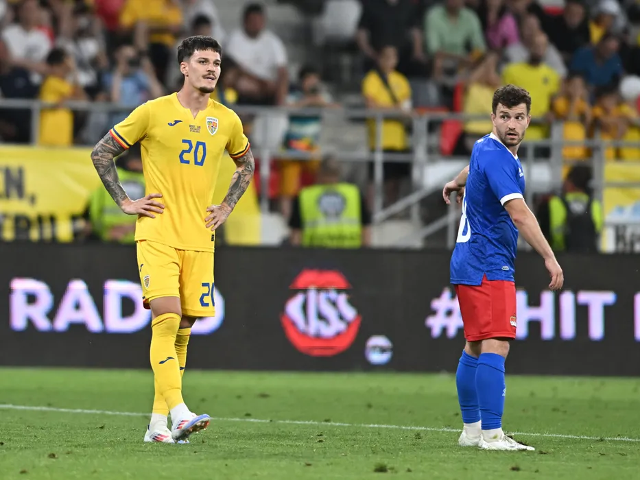 Dennis Man reactioneaza alaturi de Aron Sele in meciul amical de fotbal dintre Romania si Liechtenstein, desfasurat pe Stadionul Steaua din Bucuresti, vineri 7 iunie 2024. © FOTO:Razvan Pasarica/SPORT PICTURES
