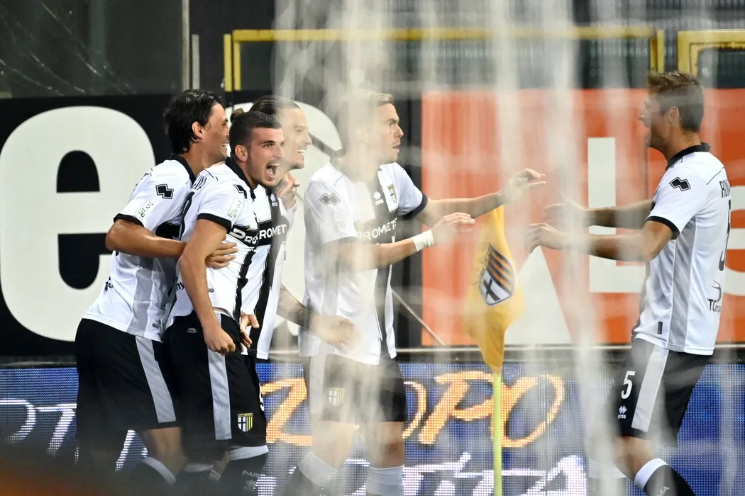 August 12, 2022 Parma, Italy - sport, soccer - Parma vs Bari - Italian Football Championship League BKT 2022/2023 - Ennio Tardini stadium. In the pic: Dennis Man (Parma Calcio) celebrates after scoring goal 1-0,Image: 713668690, License: Rights-managed, Restrictions: , Model Release: no