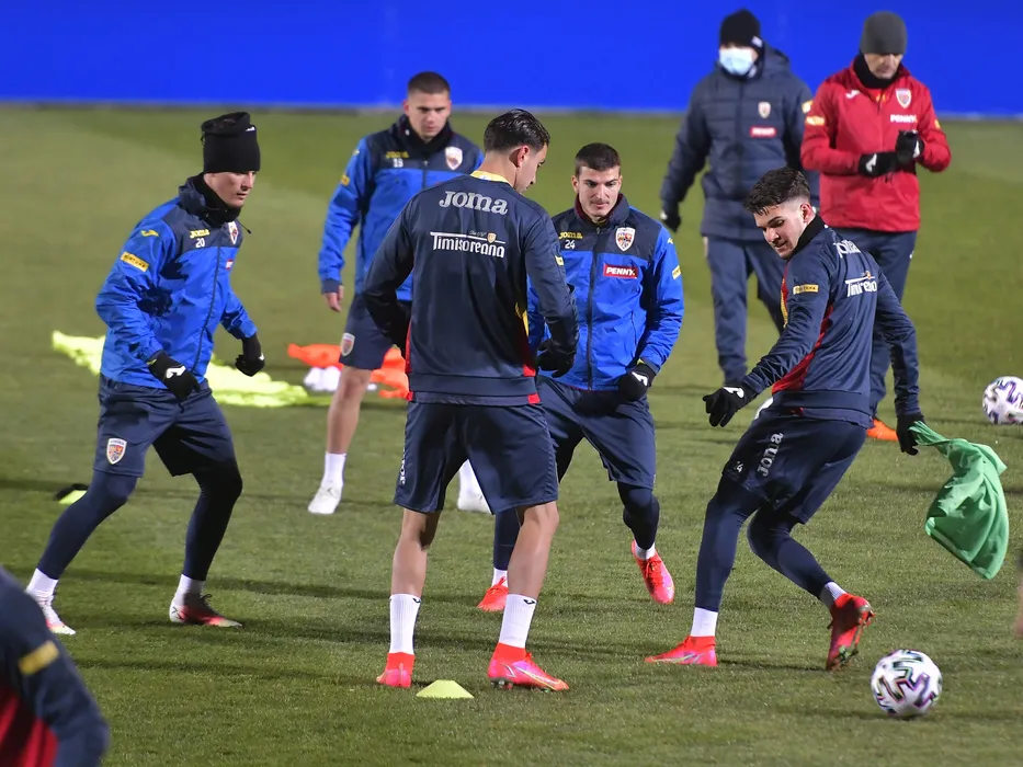 Fotbalistii nationalei Romaniei Dennis Man, Valentin Mihaila si Ianis Hagi participa la antrenamentul oficial de dinaintea meciului impotriva Macedoniei de Nord din cadrul Preliminariilor Campionatului Mondial 2022, desfasurat la Centrul National de Fotbal de la Mogosoaia, miercuri 24 martie 2021. © FOTO:Razvan Pasarica/SPORT PICTURES