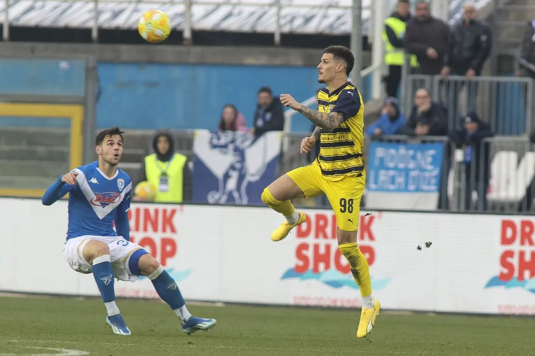Dennis Man Of Parma Calcio Heads The Ball During Brescia FC Vs Parma Calcio, 19° Serie Bkt 2023-24 Game At Mario Rigamonti Stadium In Brescia, Italy, On Dicember 26, 2023.
