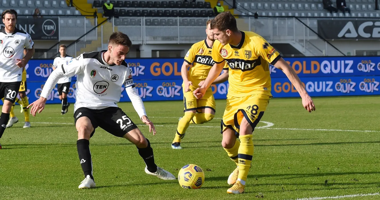 Foto LaPresse - Tano Pecoraro27 02 2021 La Spezia - (Italia)Sport CalcioSpezia vs ParmaCampionato di Calcio Serie A TIM 2020/2021 - Stadio "Alberto Picco"nella foto: mihaila mihai, maggiore giulioPhoto LaPresse - Tano Pecoraro27 February 2021 City La Spezia - (Italy)Sport SoccerSpezia vs ParmaItalian Football Championship League A TIM 2020/2021 - "Alberto Picco" Stadiumin the pic: mihaila mihai, maggiore giulio,Image: 593915673, License: Rights-managed, Restrictions: *** World Rights Except China, France, and Italy ***, Model Release: no