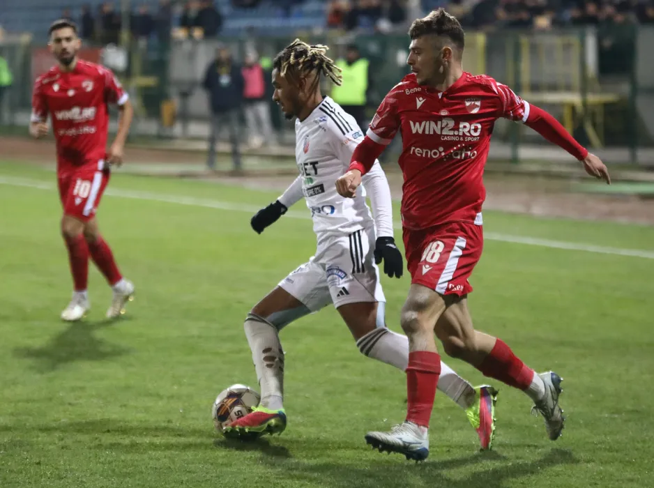 Virgile Jacky Marcel Pinson și Cristian Ionuț Costin în meciul de fotbal dintre AFC Botosani și SC Dinamo 1948 SA, contând pentru SUPERLIGA SUPERBET, desfășurat pe Stadionul Municipal din Botoșani, luni 18 decembrie 2023. © FOTO: Ionuț TABULTOC/SPORT PICTURES
