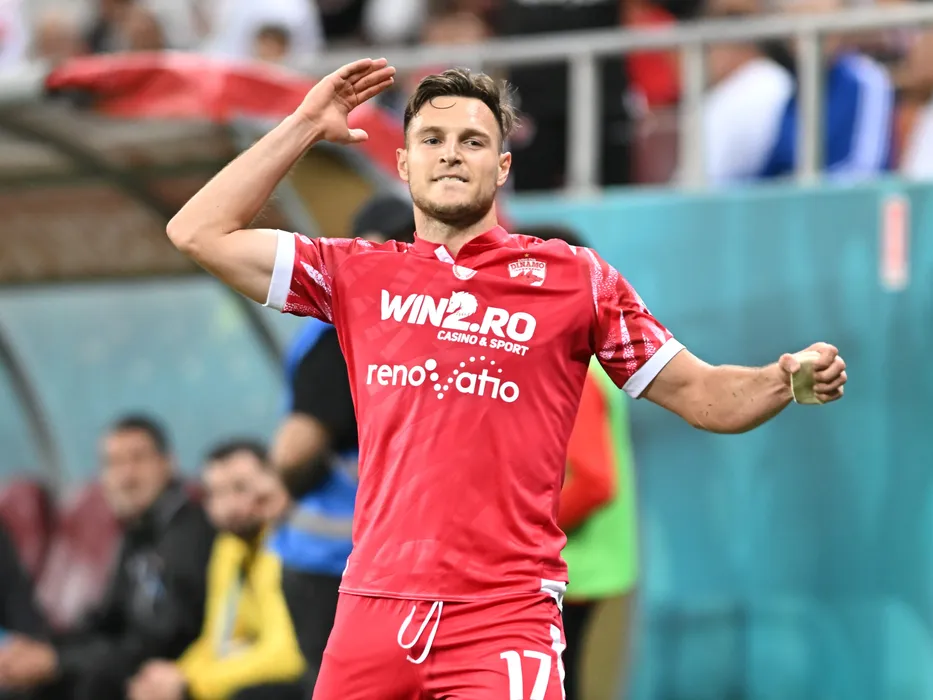 Dennis Dorin Politic saluta galeria dupa iesirea de pe teren din meciul de fotbal dintre Dinamo Bucuresti si FK Csikszereda Miercurea Ciuc, barajul tur pentru mentinerea/retrogradarea din Superliga Superbet, desfasurat pe Arena Nationala din Bucuresti, luni 20 mai 2024. © FOTO:Razvan Pasarica/SPORT PICTURES