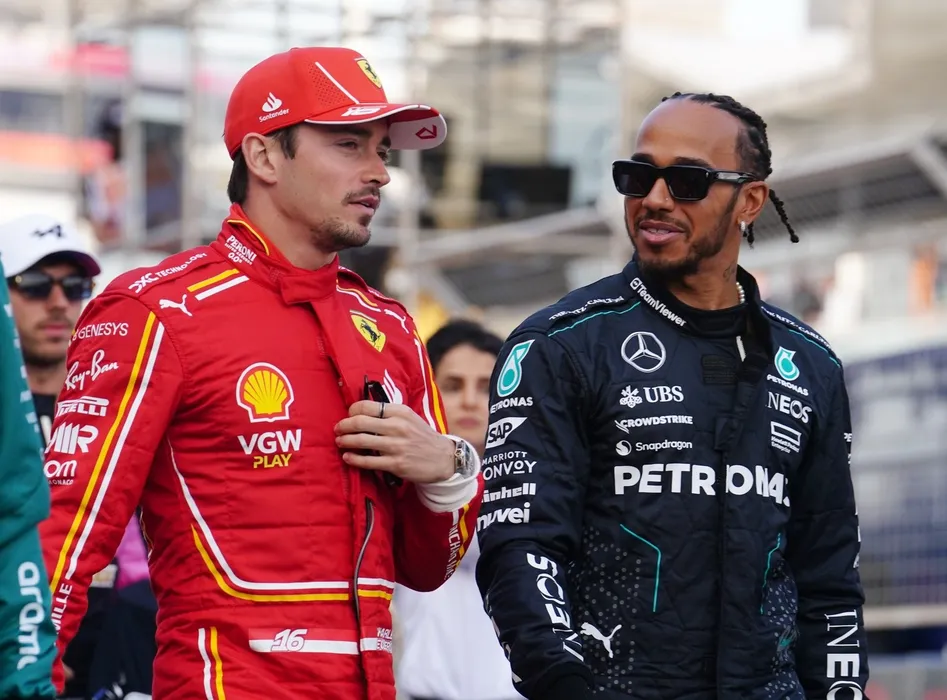 Ferrari's Charles Leclerc and Mercedes' Lewis Hamilton before the Bahrain Grand Prix at the Bahrain International Circuit, Sakhir. Picture date: Saturday March 2, 2024.,Image: 852881662, License: Rights-managed, Restrictions: Use subject to restrictions. Editorial use only, no commercial use without prior consent from rights holder., Model Release: no