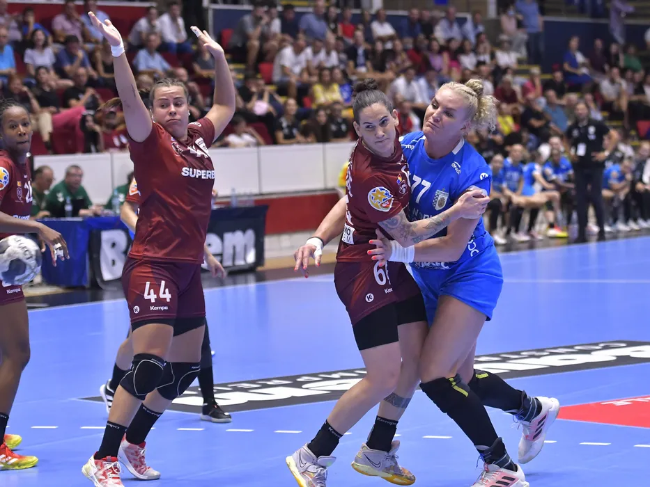 Serrador Ainhoa Hernandez, Alexandra Lacrabere si Crina Pintea in meciul de handbal feminin dintre Rapid Bucuresti si CSM Bucuresti, contand pentru Supercupa Romaniei, desfasurat in Sala Polivalenta-Ioan Kunst Ghermanescu din Bucuresti, marti 23 august 2022. © FOTO:Razvan Pasarica/SPORT PICTURES