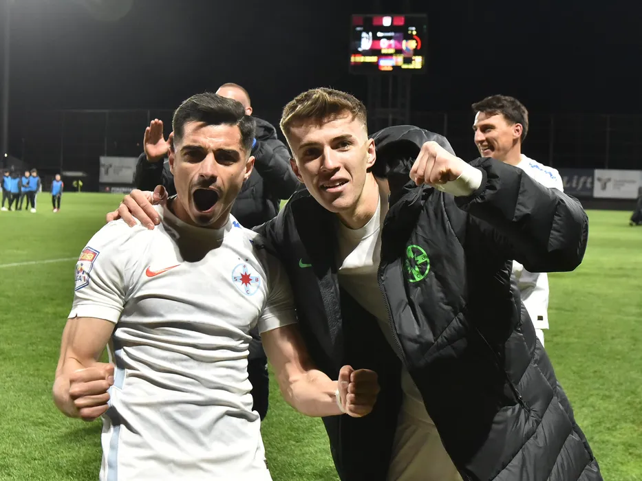 Valentin Gheorghe si Octavian George Popescu se bucura dupa meciul de fotbal dintre CFR Cluj si FCSB, contand pentru Play-off-ul Ligii 1 Casa Pariurilor, desfasurat pe Stadionul CFR Dr. Constantin Radulescu din Cluj Napoca, duminica 17 aprilie 2022. © FOTO:Razvan Pasarica/SPORT PICTURES