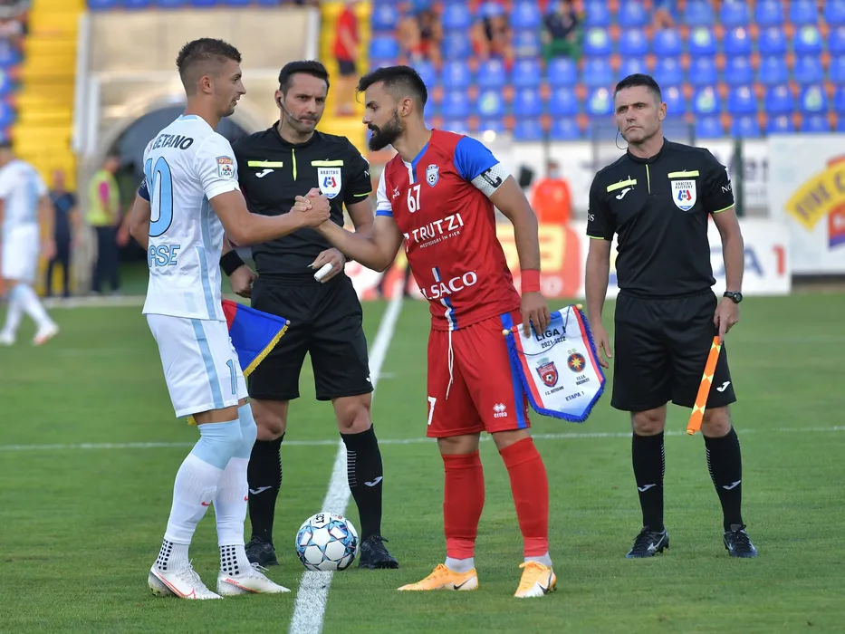 Arbitrul central Sebastian Constantin Coltescu si arbitrul asistent Adrian Popescu alaturi de capitanii Florin Lucian Tanase si Enriko Papa in meciul de fotbal dintre FC Botosani si FCSB, contand pentru Liga 1 Casa Pariurilor, desfasurat pe Stadionul Municipal din Botosani, joi 15 iulie 2021. © FOTO:Razvan Pasarica/SPORT PICTURES