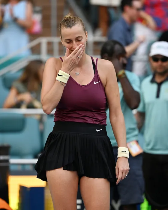 MIAMI GARDENS FL - APRIL 01: Petra Kvitova reacts during match point after defeating Elena Rybakina during the Women's Finals at the 2023 Miami Open at Hard Rock Stadium on April 1, 2023 in Miami Gardens, Florida.,Image: 766704694, License: Rights-managed, Restrictions: **Not for sale in: USA, Brazil, Mexico**, Model Release: no