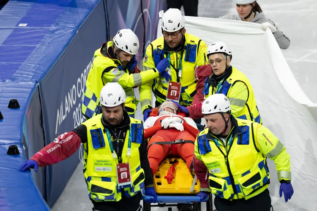 Kamila Sellier (15) of Poland is injured after a crash with Kristen Santos-Griswold (1) of the United States in the Short Track Speed Skating Women 1500m quarterfinals during the 2026 Winter Olympics at the Milano Ice Skating Arena on Friday in Milano.