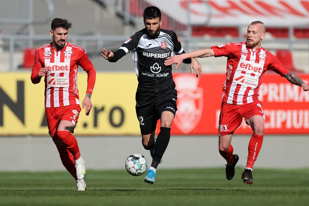 Alexandru Albu de la UTA Arad, Drazen Bagaric de la FC Hermannstadt si Modestas Vorobjovas de la UTA Arad (echipament alb-rosu) Isai disputa posesia balonului intr-un meci din play off-ul Ligii I la fotbal dintre UTA Arad si AFC Hermannstadt, meci disputant pe stadionul Francisc Neuman din Arad, vineri, 23 aprilie 2021. SEBASTIAN TATARU / MEDIAFAX FOTO