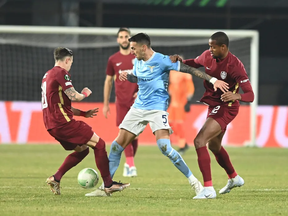 Ciprian Ioan Deac, Matías Vecino si Rangelo Maria Janga in meciul de fotbal dintre CFR Cluj si SS Lazio, din cadrul UEFA Europa Conference League, desfasurat pe Stadionul Dr. Constantin Radulescu din Cluj Napoca, joi 23 februarie 2023. © FOTO:Razvan Pasarica/SPORT PICTURES