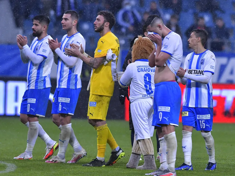 Fotbalistii craioveni Ionut Daniel Vina, Screciu Vladimir Ionut, Mirko Pigliacelli, Andrei Virgil Ivan si Lyes Hafid Houri saluta galeria dupa meciul de fotbal dintre Universitatea Craiova si FCSB, contand pentru Liga 1 Casa Pariurilor, desfasurat pe Stadionul Ion Oblemenco din Craiova, duminica 28 noiembrie 2021. © FOTO:Razvan Pasarica/SPORT PICTURES