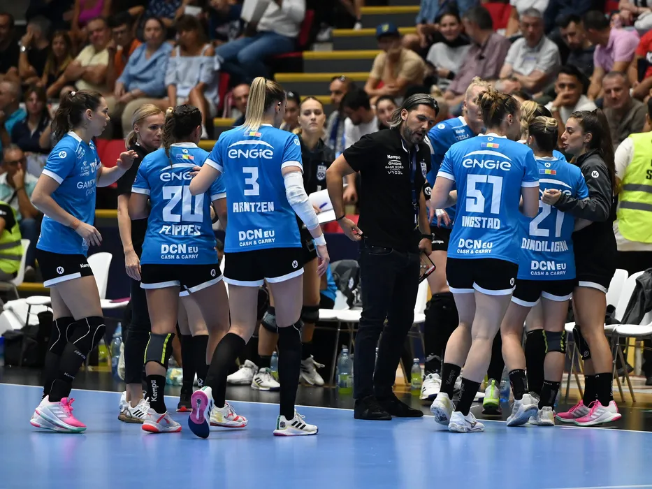 Handbalistele bucurestene la un timeout alaturi de antrenorul lor Adrian Vasile in meciul de handbal feminin dintre CSM Bucuresti si Gyori Audi Eto KC, contand pentru Liga Campionilor, desfasurat in Sala Polivalenta-Ioan Kunst Ghermanescu din Bucuresti, sambata 23 septembrie 2023. © FOTO:Razvan Pasarica/SPORT PICTURES